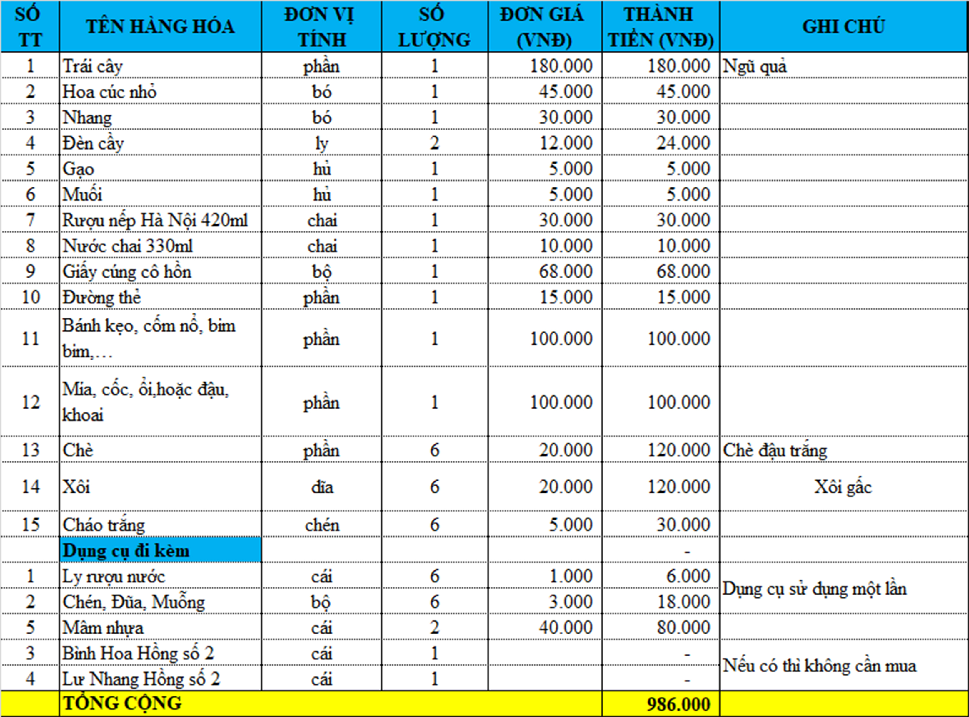 Lễ vật mâm cúng cô hồn chay tháng 7 hoặc cúng mùng 2 và cúng 16 gồm có: