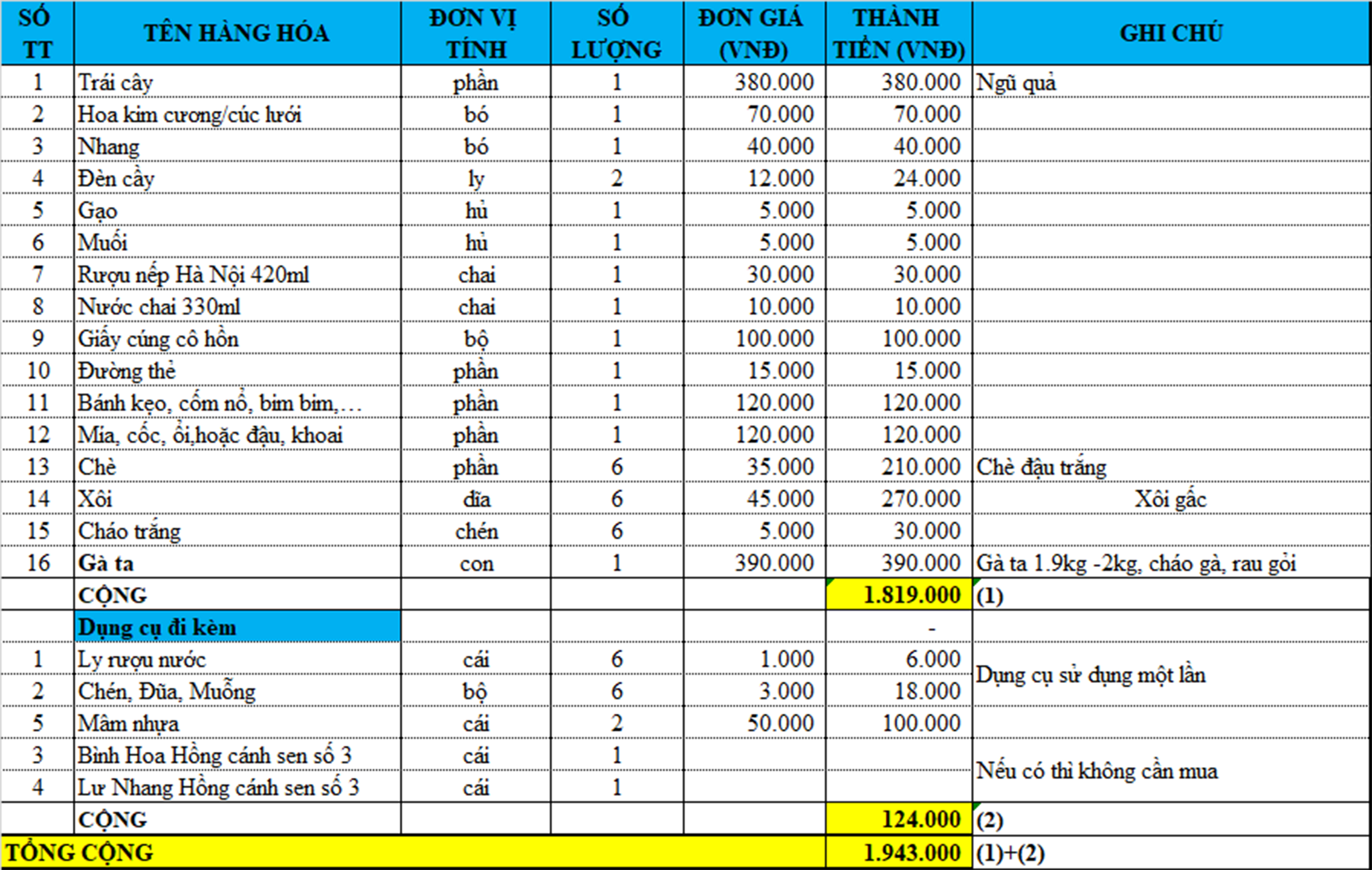 Lễ vật mâm cúng cô hồn tháng 7 hoặc cúng mùng 2 và cúng 16 gồm có: