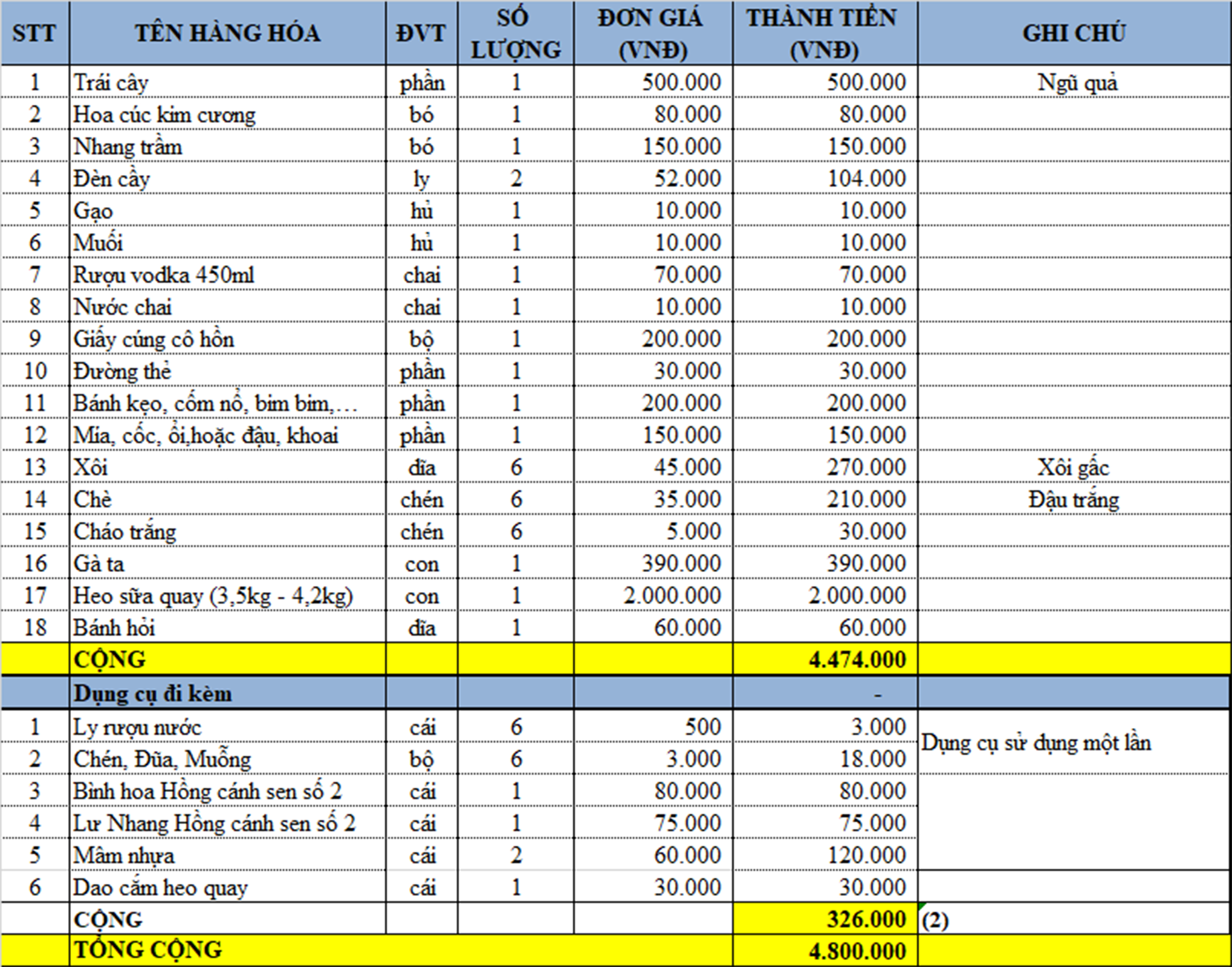 Lễ vật mâm cúng cô hồn tháng 7 hoặc cúng mùng 2 và cúng 16 gồm có: